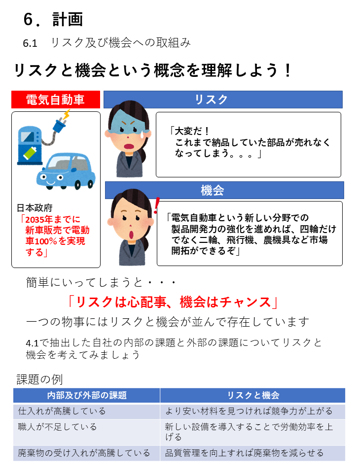 - 置かれた状況に応じて、取組みが必要とされるリスク及び機会を特定することが求められる。