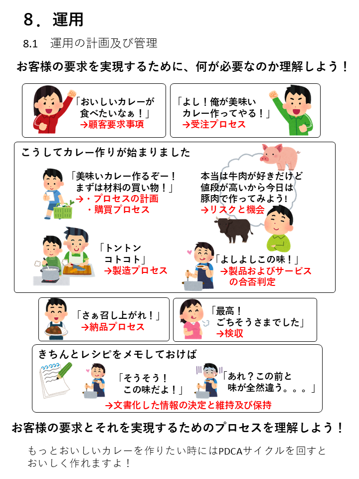 ■箇条6による計画(リスク及び機会、品質目標、変更の計画)を4.4(QMS及びそのプロセス)に従い、箇条8で具体的に展開することが示されている。