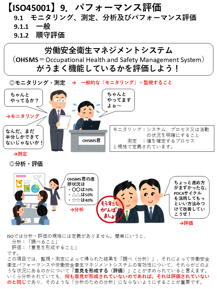 「労働安全衛生マネジメントシステムの結果をモニタリング・測定・分析し、有効に機能しているかを評価しなさい」ということです。