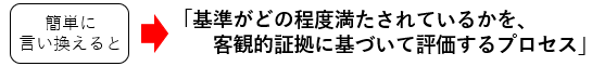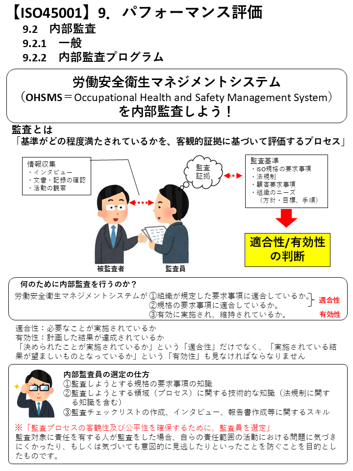 「監査基準が満たされている程度を判定するために、監査証拠を収集し、それを客観的に評価するための体系的で、独立し、文書化されたプロセス」(ISO45001:2018, 3.32)