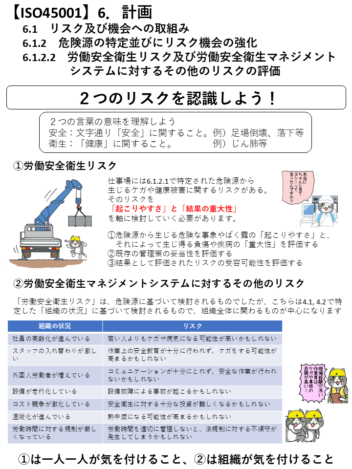 - システムレベルのリスク: 労働安全衛生マネジメントシステムそのものが有効でなくなるようなリスクを考慮し、対策をとる。これにより、マネジメントシステム自体が組織の戦略的方向性にとって意味のあるものであり続けることができます。