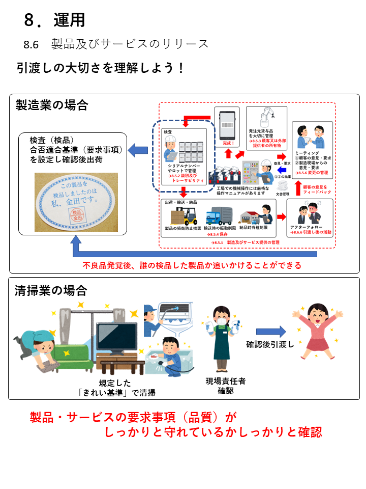 この「製品・サービスが要求事項を満たしていることの確認」は、製造業においては最終検査や出荷検査といった検証を行なった上で出荷する、ということを意味するでしょうし、清掃業や修理業といったサービス業においては、顧客に引き渡す前にサービスの出来栄えを確認した上で引き渡す、ということが該当するでしょう。